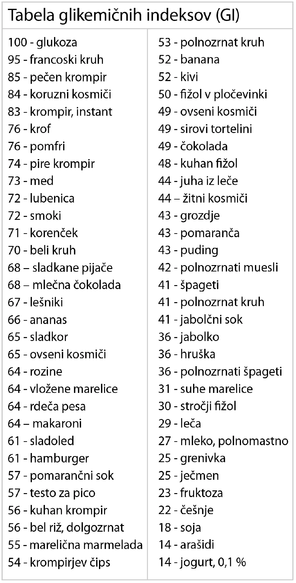 Diabetiki naj se živil, ki imajo glikemični indeks (GI) višji od 100 izogibajo.
