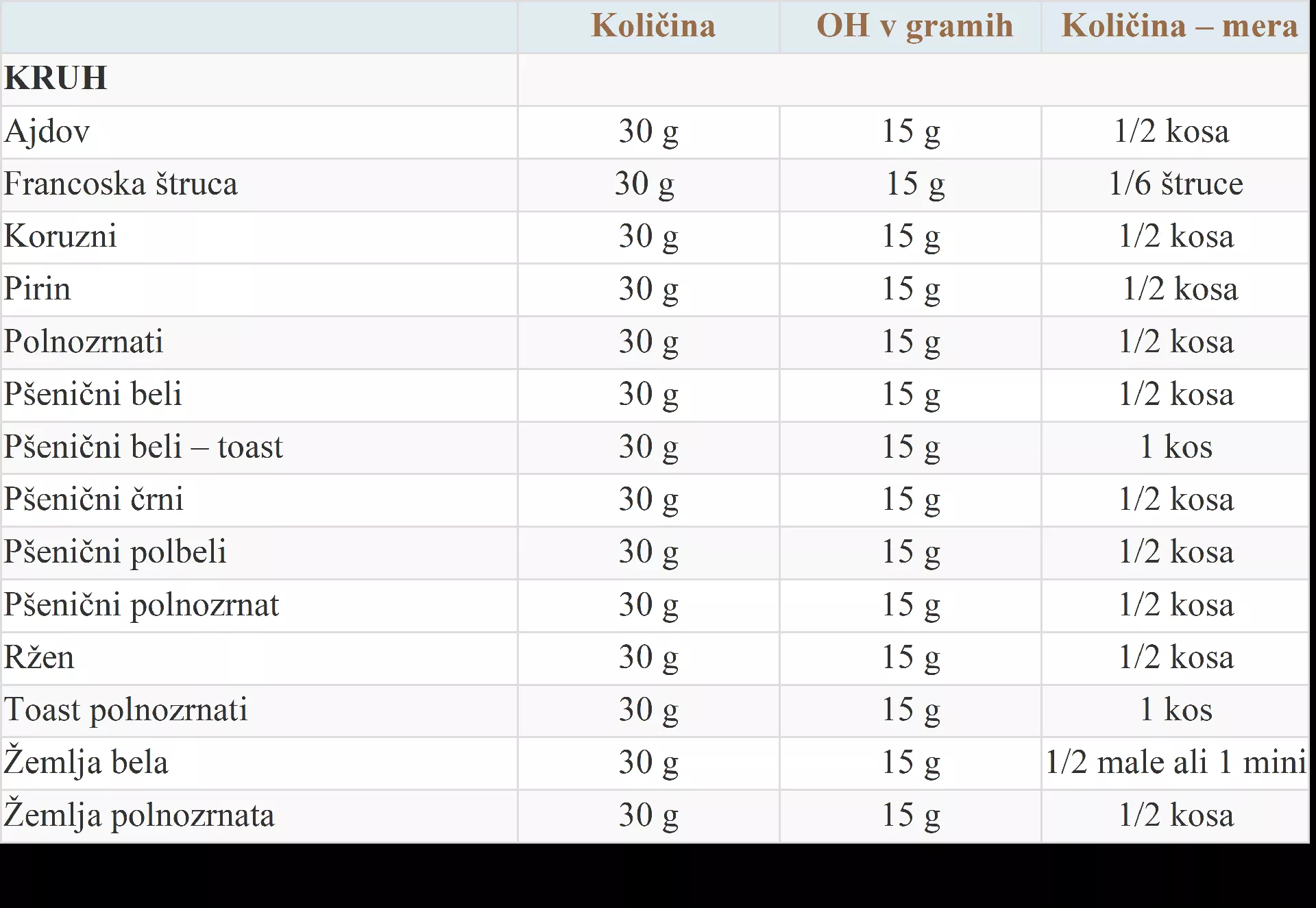 Koliko OH vsebuje določena vrsta kruha, najdete v priloženi tabeli. Vidimo, da v količini OH na količino določenega kruha, bodisi bel, bodisi polnozrnat, ni razlike. Edina razlika med vrstami kruha je GI, ki je višji pri kruhu z bolj prečiščeno moko in zato hitreje dvigne krvni sladkor, količina zaužitih OH na porcijo pa je enaka. Zato diabetikom svetujemo, da je za dobro obvladovanje sladkorne bolezni v tem primeru zaželeno štetje OH in pa previdnost pri zaužitju količine kruha.